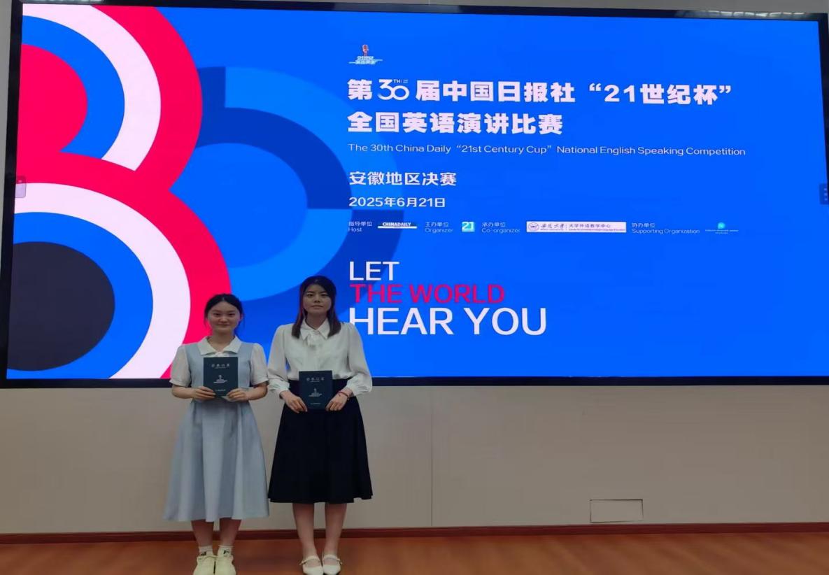 6月21日,第30届中国日报社“21世纪杯”全国英语演讲比赛安徽地区决赛在安徽大学举行。来自安徽大学、合肥工业大学、安徽师范大学等省内10多所高校的学子参加比赛。金年会教育科学学院学生李慧娴、金年会官网学生黄慧慧在金年会官网教师方莉、王巧指导下,分别获得二等奖、三等奖的佳绩。