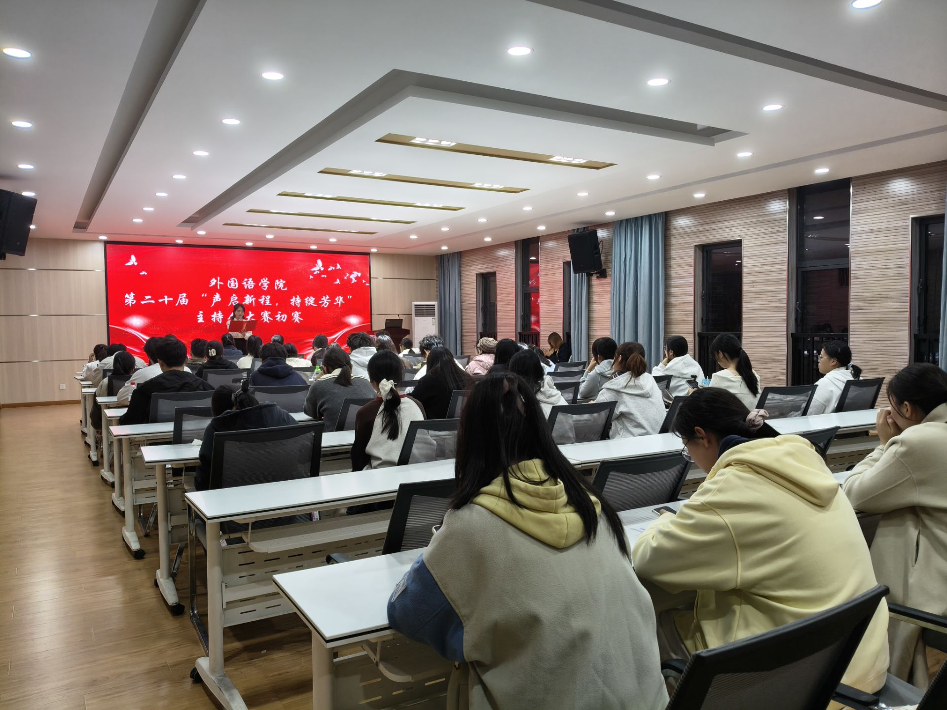 10月22日,金年会官网第二十届“声启新程,持绽芳华”主持人大赛初赛于逸夫楼5306教室顺利拉开帷幕。本次比赛旨在丰富校园文化生活,发掘与培养学生主持人才,展现外院学子的卓越风采。马进、曹媛媛两位老师受邀担任比赛评委。