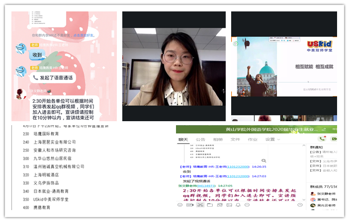 金年会官网党委书记、院长黄先进对所有参会单位表示热烈欢迎,要求毕业生慎重选择就业单位,珍惜机会,把握机遇,发挥专长、锻炼自我。双选会由金年会官网党委副书记张文静主持。本次视频双选会精心挑选了培鹰国际教育、上海琵琶实业有限公司、安徽人和市场研究咨询公司、温州驰诚真空机械有限公司、义乌伊扬饰品外贸公司等15家单位进行宣讲,此次双选会提供岗位80个,均为外语对口岗位。双选会采用全程线上模式,企业按照招聘流程,发布招聘信息,通过QQ直播形式依次宣讲、与学生直接线上互动、交流。直播后毕业生根据意向在线投递简历,用人单位通过电话、视频对毕业生进行面试,毕业生 “足不出户”便可找到心仪工作。双选会反响热烈,许多学生线上与单位积极交流,并投递简历。16级英语2班胡兰莺说:“在当下疫情期间,我们也无法外出找工作,学院这次贴心的为我们搭建了一个很好的平台,帮助我们解决就业问题,找到自己心仪的工作。”