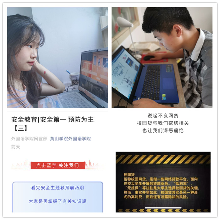 近日来该院微信公众号上发布安全主题教育系列推文,将六点安全教育知识分为户外安全和防灾减灾、不良网贷和网络诈骗、预防传销和禁毒教育三部分普及知识连续推送;同时,通过qq平台发布安全教育知识,增强学生安全意识,提高避险能力。
