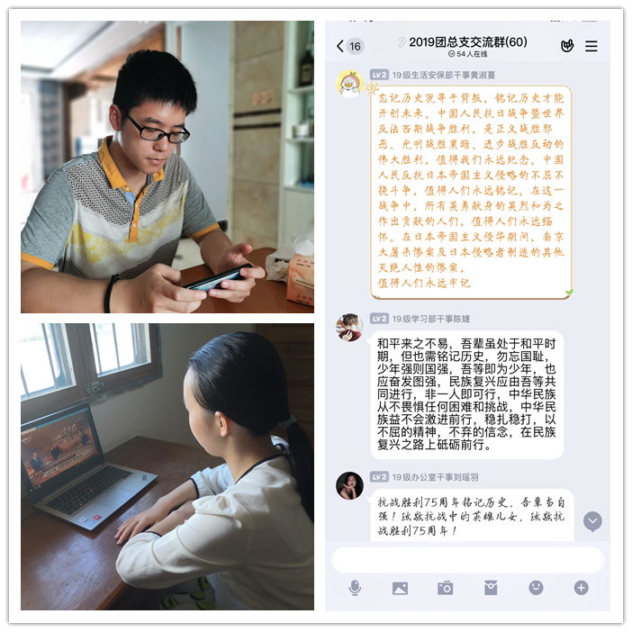 在收看过程中,同学们聚精会神聆听、认真思考,共同回顾七十五年前那场荡气回肠、波澜壮阔的民族自卫战争,感受抗日英雄们浴血奋战、穷其生命追求民族自强的精神。观看结束后,该院学生通过钉钉、QQ等网络平台讨论观看心得,大家纷纷表示,作为新时代大学生,应当谨记团结奉献的抗日精神,把满腔爱国之情化为工作的强大动力,努力扎实地做好本职工作,为中华民族的伟大复兴而奋斗。