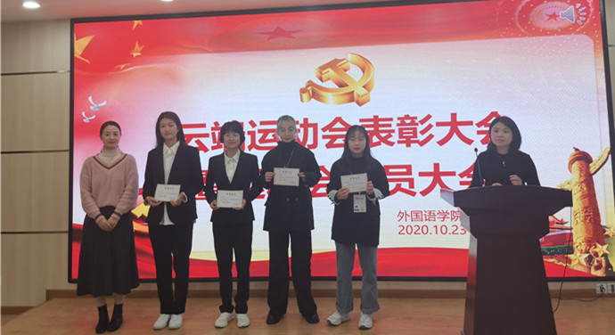 张文静传达了学校体委工作会议精神,介绍了2020年学校体育赛事的安排。她表示田径运动会是奋力拼搏、超越自我精神的展现;是凝心聚力、携手奋进集体荣誉感的爆发;是绽放青春,挥洒激情的舞台。全体学生在运动会期间都要遵纪守法、文明有序,主动作为、积极参与,用行动为运动会顺利开展护航;学生干部要各司其职、各尽其责,热情大方、耐心细致,做好比赛的服务、后勤保障工作;运动员要科学训练、合理作息,遵守规则、奋力拼搏;赛出风格、赛出水平,展现外院学子团结友爱,顽强拼搏的精神风貌。 陈铭宣读2020年云端运动会金年会官网优秀个人名单、2019年体测优秀名单,并为获奖同学颁发荣誉证书。