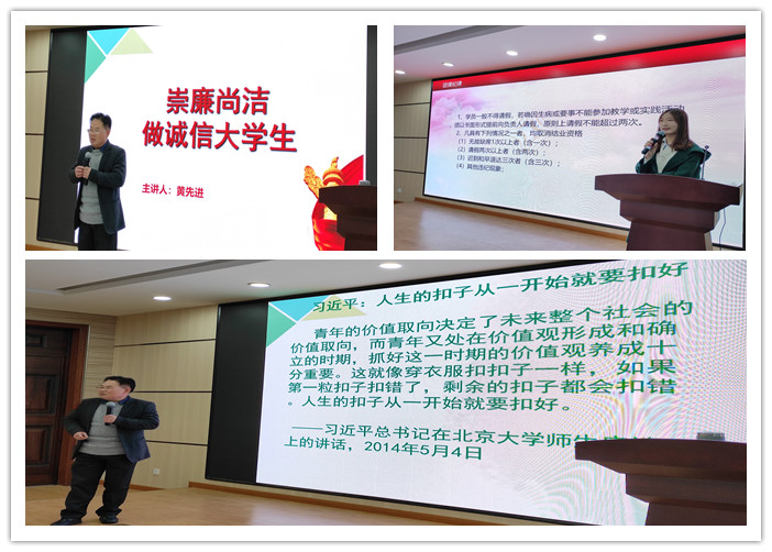 金年会官网党委书记、院长黄先进作为主讲人,做“崇廉尚洁、做诚信大学生”的廉洁教育讲座。黄先进讲述了党中央对于廉洁的要求:要把权力关进制度的笼子里,形成不敢腐的惩戒机制、不能腐的防范机制、不易腐的保障机制。此外,黄先进从四个“需要”强调了大学生廉洁教育的重要性:大学生廉洁教育是高校人才培养的需要、是高校廉政文化建设的需要、是构建和谐社会的需要以及是弘扬中华民族传统美德的需要。黄先进指出,考试舞弊、论文抄袭、骗取或恶意拖欠国家助学贷款、毕业生就业诚信缺失、部分学生干部行为失范和生活奢侈浪费都是大学生不廉洁修身的具体表现。他提出大学生应树立廉洁的风尚和品格,向廉洁高尚的榜样学习,并不断提高自身的思想道德修养。随后,黄先进阐述了十九大释放的八大重磅反腐信号。