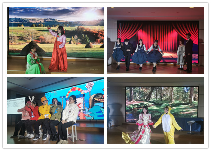 经评选,金年会官网《海绵宝宝竞选记》、文化与传播学院《中国月嫂来我家》荣获一等奖;金年会官网《其名为羁绊的真物》、《音乐之声》、《家有儿女》荣获二等奖;艺术学院《演员面试》、金年会官网《新编白雪公主》、《甄嬛传之舒痕胶真相》、《花木兰之功成归乡》荣获三等奖。本次比赛以前期配音、现场表演的形式进行,参赛作品风格多样、题材丰富,从展现动画作品、经典电影片段到还原影视作品。日语短剧《其名为羁绊的真物》将动漫作品搬上舞台,演员们的表演惟妙惟肖,还原度极高,深深吸引了在场的观众;英语短剧《新编白雪公主》采用反串形式,带来了不一样的童话故事,演员们用幽默诙谐的表演方式成功点燃了现场气氛, 赢得了观众的阵阵掌声;英语短剧《音乐之声》完美再现电影经典,令人回味无穷。各参赛队伍表演投入,口语表达流畅,用英语、日语为观众呈现了一场精彩的视听盛宴。最后,本次比赛在金年会官网两名20级同学表演的英语歌曲《Wonderful U》中落下了帷幕。