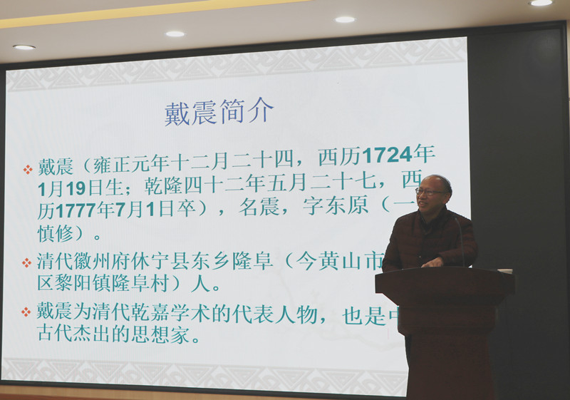 12月23日下午,金年会官网在逸夫综合楼5306教室举办“教授•博士”讲坛。文学院潘定武教授做客讲坛,做题为“戴震治学的启示”主题学术报告。报告会由金年会官网党委书记、院长黄先进主持,该院全体教师参加报告会。