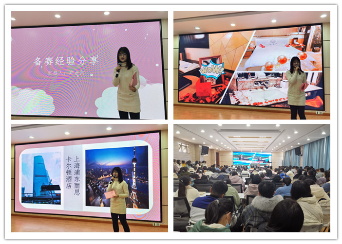 郑永红介绍了世界技能大赛以及酒店接待项目的相关知识,包括比赛流程、着装要求以及参赛者必备素养,让同学们对这项比赛有了初步的认识,分享了在酒店的见习经历和备战大赛的经验。她表示,在酒店的实地见习工作让她对酒店接待有了更详细的了解。作为外语专业的学生,酒店接待是跨专业项目,但是通过不懈努力,也可以取得优异的成绩。郑永红表示:“这次比赛是一次难忘的经历,不仅让我增长了见识,拓宽了视野,结交到了新朋友,而且经受了历练,得到了锻炼,获得了内心的成长。”最后,郑永红对到场同学的提问逐一解答。