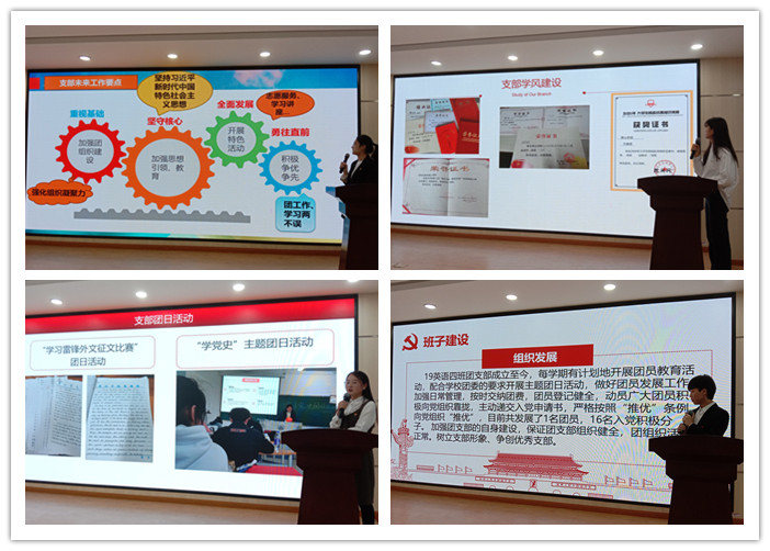 活动伊始,各团支部代表依次上台进行PPT汇报,汇报内容包括支部班子建设、支部特色活动、支部学风建设、出勤卫生情况、支部获奖情况、青年大学习观看情况等方面。各支部向大家展示了各具特色、风格各异的支部风采。答辩环节上,评委就支部建设及支部特色进行提问,并指出了各支部在团组织建设上存在的优点与不足,同时就日后团组织建设活动的开展提出了意见和建议。经现场评委打分,最终,19英语1班团支部和20英语2班团支部荣获“金年会官网2020年度活力团支部”。