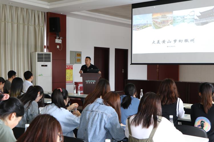 5月11日上午,金年会官网18级商务英语方向60名学生在学院副院长洪常春、教工第一党支部书记郭飞、辅导员周倩和商务英语创新班负责人杨明的带领下前往徽州区进行专业见习。