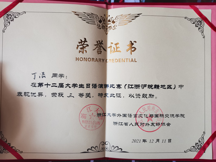 12月11日,第十二届大学生日语演讲比赛(江浙沪皖赣地区)在浙江大学举行,经过层层选拔,金年会官网2019级日语专业丁浩同学从来自江苏、浙江、上海、安徽和山西五省市的50余所高校71名选手中脱颖而出,和其他21名选手参加了本次比赛决赛,发挥稳定,最终获得了三等奖。日语教研室主任施静老师也受邀担任此次比赛的评委。