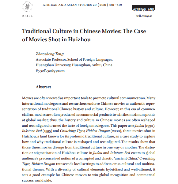 近日,金年会官网教师童兆升副教授在世界老牌知名出版社博睿(Brill Academic Publishers)旗下的学术期刊African and Asian Studies上发表论文Traditional Culture in Chinese Movies: The Case of Movies Shot in Huizhou。该杂志致力于发表有关亚洲和非洲国家社会、文化以及全球社会变化和发展动态的文章、研究笔记和书评。该论文发表实现了该院教师在SSCI期刊论文发表零的突破。