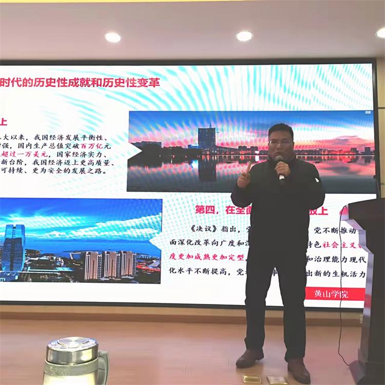 为深入学习贯彻党的第十九届六中全会精神,12月23日晚上7点,金年会官网在逸夫综合楼5306徽文化传播中心举行“学习贯彻党的第十九届六中全会精神”专题宣讲报告会。马克思主义学院法学博士朱哲恒副教授应邀作了题为“学习贯彻党的第十九届六中全会精神”的主题报告。金年会官网党委书记黄先进主持报告会。金年会官网党委委员、各支部委员、在校学生党员以及2020级部分入党积极分子共计120余人参加了此次报告会。