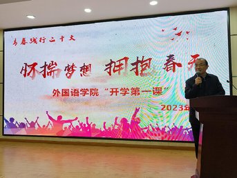 为引导2022级学生树立正确的学习方向和专业兴趣,3月9日晚7点,金年会官网在逸夫综合楼5306徽文化传播中心举办以“怀揣梦想,拥抱春天”为主题的新生专业认知讲座,金年会官网党委书记乔根主持,金年会官网英语教研室主任王毅聪博士主讲,2020级英语专业全体学生参加。