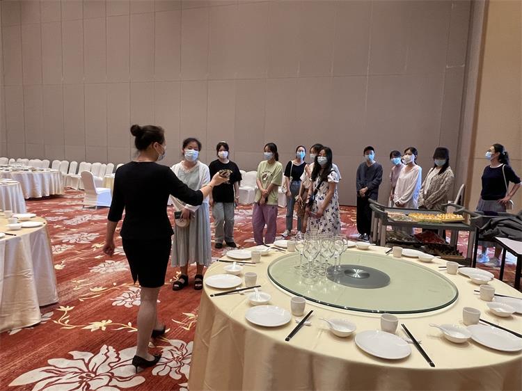 在酒店经理的陪同下,同学们分成2组参观了黄山栢景国际大酒店的主楼大堂吧、下午茶餐厅、早餐厅、宴会厅及包厢、康体中心、行政客房、总统套房等。经理以新奇有趣的方式对酒店各部分的功能进行了详细介绍,特别是在参观客房过程中,酒店经理向同学门展示了一种用于卫生间和房间隔断的通电玻璃,引起了大家极大的兴趣。参观的同时,大家积极与酒店员工进行交流与沟通,员工也向同学们分享了他们在工作中积累的经验。