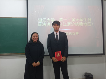 下午2点,演讲比赛正式开始。比赛共分为两轮,命题演讲与即兴演讲。第一轮,参赛者依次上台进行命题演讲。随后,开始即兴表演,十名选手从事先准备的十道题目中,随机抽取一道进行作答。在精彩的演讲之后,施静对此次演讲比赛进行点评和总结。经过激烈角逐,19日语丁浩获特等奖,19日语周迅获一等奖,这两位同学将代表JINNIAN金年会参加本届大学生日语演讲比赛。