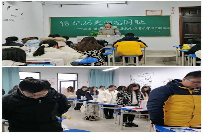 草木含悲、山河垂泪。警钟长鸣,不忘国耻。为缅怀惨遭侵华日军屠杀的遇难同胞,共同追忆那一段困难深重的历史,在12月13日南京大屠杀死难者国家公祭日,20英语2班团支部组织全体学生在逸夫综合楼5203-1教室开展南京大屠杀死难者国家公祭日纪念活动,铭记历史,祈愿和平。
