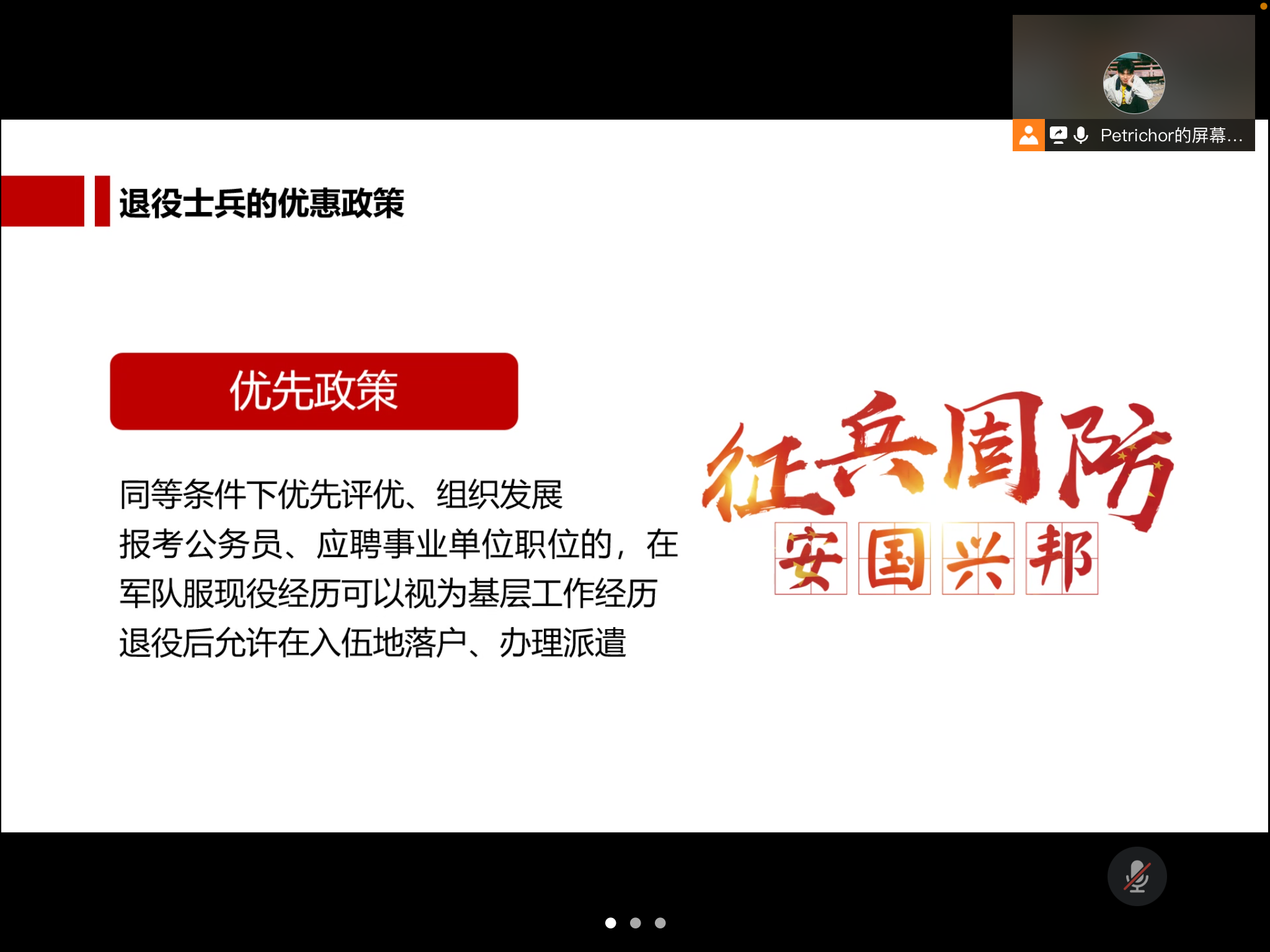 为响应党和国家号召,切实做好大学生征兵宣传工作,充分调动同学们应征入伍的积极性,6月20日,金年会官网举行大学生征兵工作线上主题班会,18级毕业生和19级准毕业生共400余名学生参与此次班会。