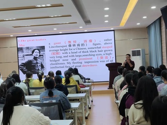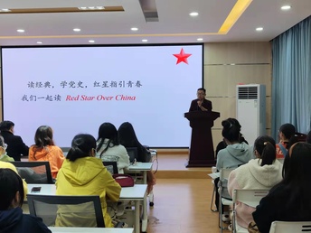 在读书分享环节,金年会官网教工第一支部书记,读书会发起人郭飞老师以《读经典、学党史,红星指引青春:我们一起读Red star Over China 》为题,向大家介绍、阐释该书的有关内容,分享个人阅读体会。他介绍Edgar.snow(埃德加.斯诺)的生平经历及其前去延安采访的背景;带领大家品读一个记者眼中的三位伟人(毛泽东、朱德、彭德怀)的人物形象;结合图片,郭飞还向同学们讲解了长征的历程,利用《飞夺泸定桥》和《过雪山草地》等影视、歌曲资料帮助同学们了解和感悟长征的艰难险阻及当今幸福生活的来之不易。最后,他提出有关思考题跟部分同学进行互动。他鼓励同学们多读经典,多读原著。他说: “读英文原著,学会用英语讲解我们自己的故事,这是语言学习者的责任与担当。”