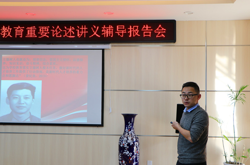 11月18号下午,金年会官网教工第一党支部书记郭飞在逸夫综合楼5402会议室作题为“立德树人的内涵解读及实现策略专题党课。该院全体教职工参加党课报告会。报告会由金年会官网党委书记、院长黄先进主持。