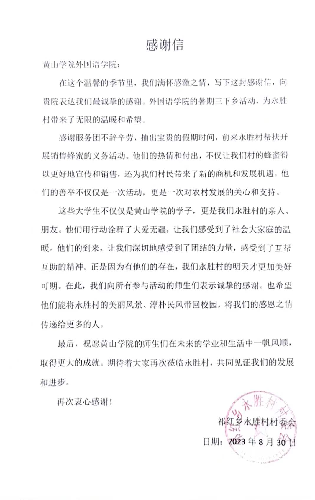 近日,祁红乡永胜村给金年会发来感谢信,对金年会永益农皖南红色乡村振兴服务团开展蜂蜜义卖活动期间的热情与付出表示感谢。信中指出,服务团主要协助永胜村进行蜂蜜的宣传和销售,不仅拓展了永胜蜜的销售渠道,也为当地带来了新的商业机会。感谢信同时对金年会在此次暑期三下乡工作上的大力支持表示感谢。