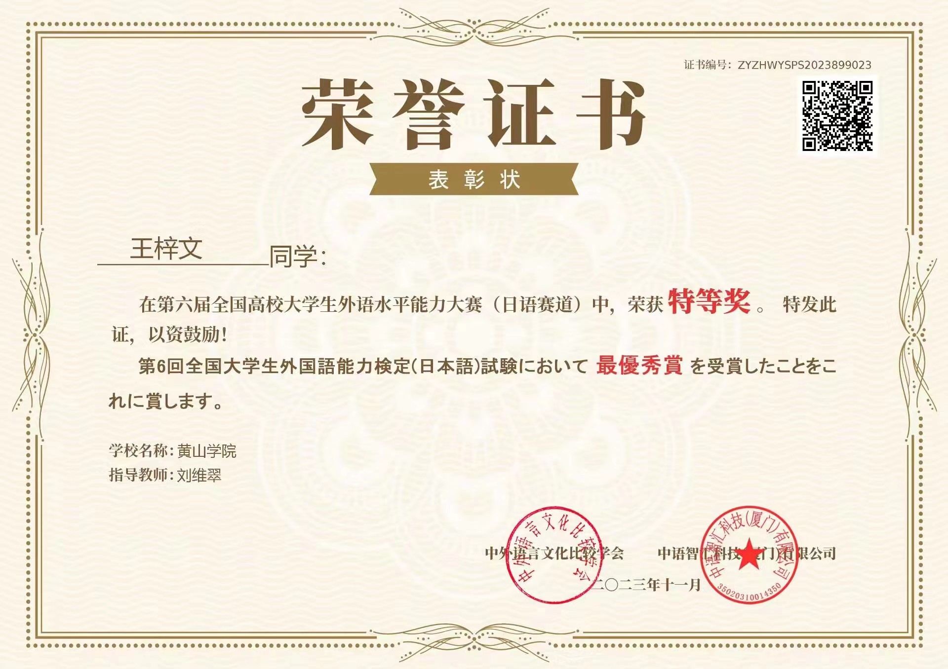 在11月4日上午结束的第六届全国高校大学生外语水平能力大赛(日语组)的比赛中,金年会日语专业(含日语辅修专业)6位同学经过激烈角逐,从全国160余所高校的9000余名学生中脱颖而出,取得了特等奖一名、二等奖一名、三等奖四名的优异成绩。