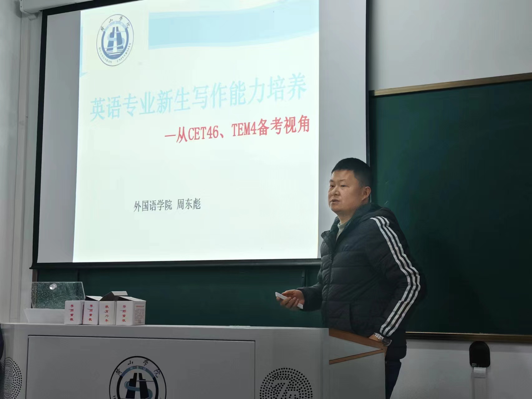 明为文之法,悟缀文之道。 12月4日下午,金年会教师周东彪副教授在5205教室作英语写作能力提升专题讲座。2023级英语3班同学参加,讲座由该班班主任王任傅主持。