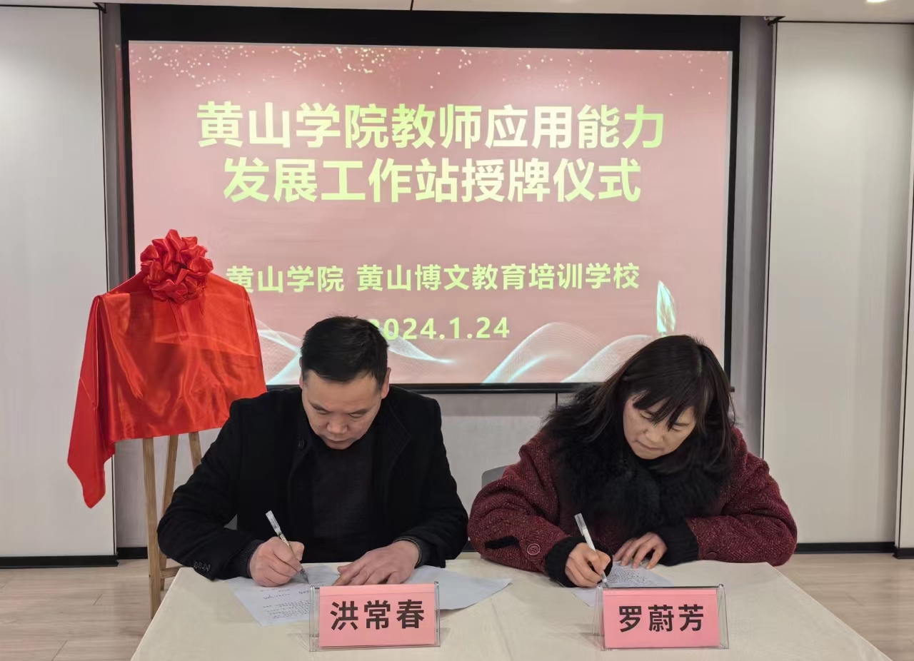 1月24日上午,金年会与黄山博文教育培训学校举行教师应用能力发展工作站签约挂牌仪式,签约仪式在博文教育培训学校进行。JINNIAN金年会人事处副处长(主持工作)曹盈、金年会官网院长洪常春、日语教研室主任李艳,黄山博文教育培训学校校长罗蔚芳、副校长陈湘凯、副校长孙菲等相关人员参与了签约授牌仪式。