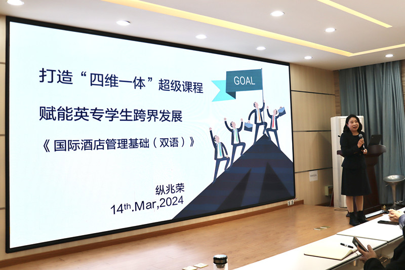 纵兆荣以“打造‘四维一体’超级课程,赋能英专学生发展”为题,以《国际酒店管理基础》课程教育教学为例,介绍了她对“超级课程”这一全新课程教学理念的理解。她建议,要从设定学习目标入手,探索激发学习者的内驱力,支持并呵护学习者在胜任感、自主权、亲密关系三方面的基本需求,引导学生从中受益。