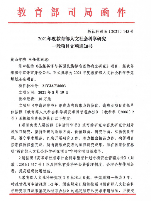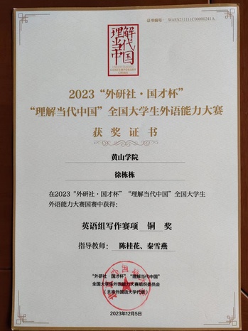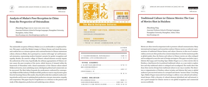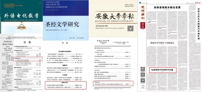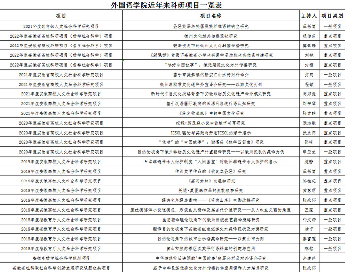 通过青年教师导师制、“教授•博士”论坛等,多措并举助推教师教育教学改革和科学研究工作。近五年,学院教师获批省级“质量工程”32项,校级“质量工程”立项31项。获批教育部人文社会科学规划基金项目1项,省级人文社会科学研究重点项目22项,省级一般项目8项;校级项目9项。横向项目到账经费150余万元。出版专著4部、译著4部,编写教材5部;在SSCI、CSSCI等各类刊物发表三类以上教科研论文108篇。科学研究促进教育教学的同时,也发挥了弘扬地域优秀传统文化的职能。在立项的40项科研项目中,有26项致力于徽州文化及其对外传播的研究。
