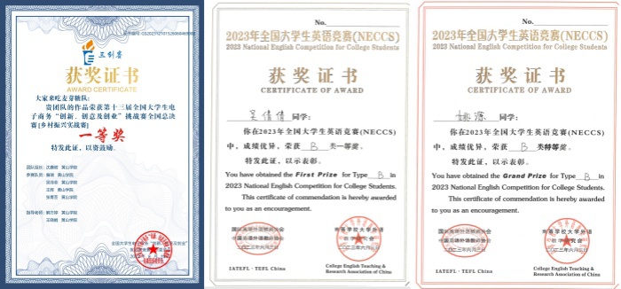 坚持以赛促教、以赛促学、以赛促创,推动创新教育制度化、常态化、长效化。近五年,学院41名学生获国家级竞赛奖励,81名学生获得省级竞赛奖励。其中,12人获AB类学科竞赛国家级三等奖以上奖项,45人获AB类学科竞赛省级二等奖以上奖项。1个学生团队获第十三届全国大学生电子商务“三创赛”乡村振兴实战赛一等奖;1人获中华人民共和国第二届世界技能大赛酒店接待项目第6名并于近期被推荐参评2023年度安徽省青年岗位能手,获奖数量和质量均创历史新高。