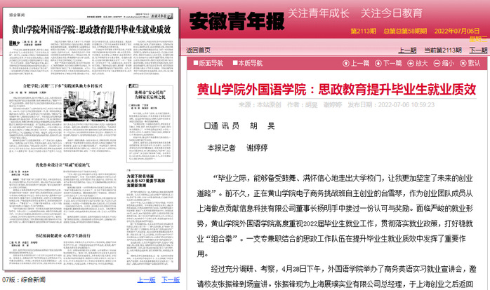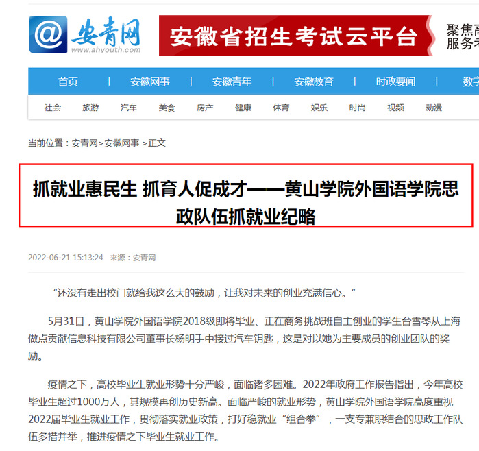 加强校外联合基地建设,与上海做点贡献信息科技有限公司签订《校企合作共建协议书》,共建商务英语挑战班,孵化创业项目多项,学生自主创业共有27名,安青网以《抓就业惠民生 抓育人促成才》专题报道;与上海外国语大学跨文化研究中心、上海外语教育出版社合作共建“跨文化能力研究与测评基地”,推动高层次高质量的跨文化外语教学与研究;与黄山博文教育培训学校合作,提供技术支撑与决策支持,服务地方产业结构转型升级的同时,助力黄山市学子参加日语科目高考。