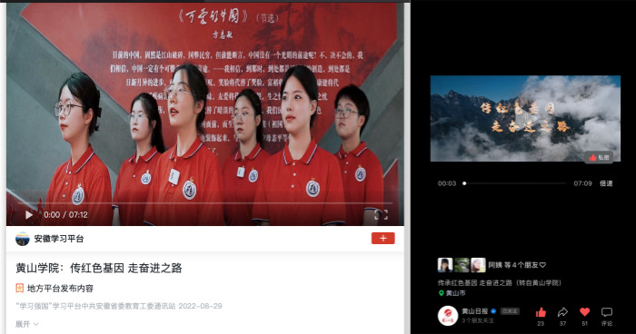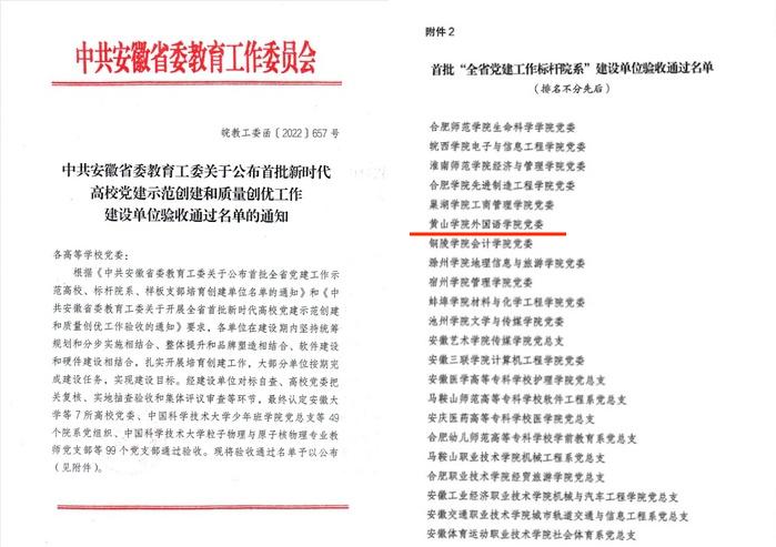 深入推进“融入式”党建,发挥党建在教书育人、管理育人和服务育人中的作用,开展“书记好党课、支部好案例、党员好故事”“三个好”活动,各支部均树立了支部品牌,先后与歙县新溪口中心学校党支部、休宁县临溪中心小学党支部、黄山文投集团歙州阳产土楼文化旅游发展有限公司党支部等开展合作共建;遴选了党员好故事33篇,开展书记好党课20余次,征集支部好案例10个;实施“灯塔工程”,组织红歌拉歌赛、红色电影外文配音比赛、红色故事分享会、双语党团知识竞赛、红色小故事入课间等活动,铸就学生爱党、爱国情怀,1名学生获安徽省2021年大学生党史知识竞赛一等奖。