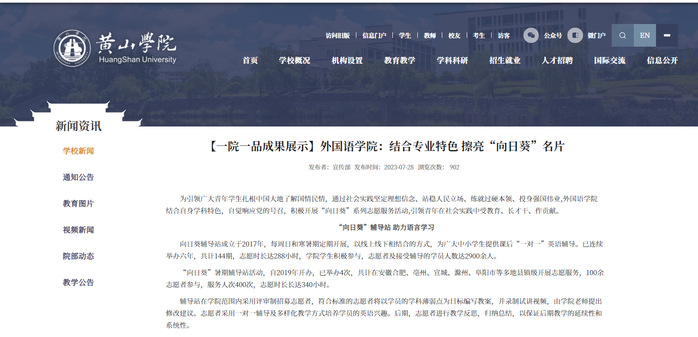 I志愿——育学风。学院学子展现青年担当,积极参与各项志愿服务。向日葵“辅导站”志愿活动自2017年成立以来,已累计辅导1700名学生,志愿时长达4000小时,成功入选为金年会第二批“一院一品”活动,广受好评;成立“向日葵”宣讲团,以宣讲的形式传承弘扬中华优秀传统文化,用外语说好中国故事。“向日葵”宣讲团2022年拍摄双语视频在学习强国、安徽日报等平台展示,2023年入选暑期三下乡“圆梦工程”志愿服务团队,获校成果汇报一等奖。
