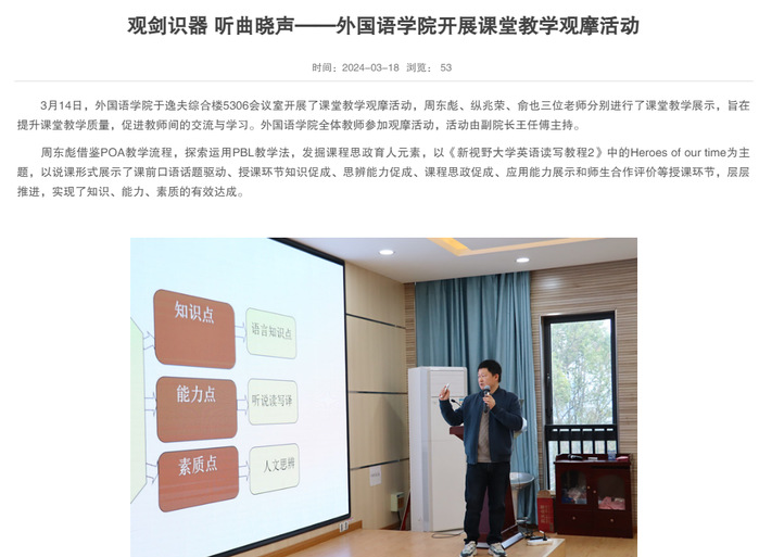 在《大学英语》课上,周东彪老师向00后青年大学生诠释“英雄”的时代内涵。在他看来,英雄(HERO)应该具备humanity (仁爱之心)、enterprise(进取向上)、resilience(坚韧不拔)、optimism(乐观豁达)等品质。课程思政,有力有效;寥寥数语,意味深长。