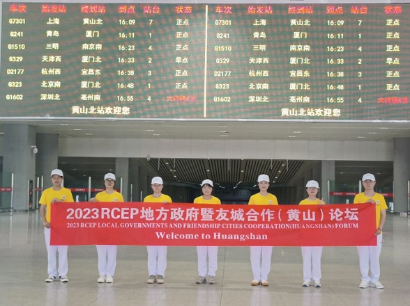 服务大型外事活动,助力黄山市打造“国际会客厅”。建成黄山市徽文化对外宣传研究中心、金年会官网外事服务志愿者中心。定期举办外事礼仪、徽文化知识外宣等主题外事志愿者培训,进一步提升师生志愿服务的能力水平。志愿服务“四季黄山 相约春天”中外人士交流会、2023RCEP地方政府暨友城合作(黄山)论坛、第十三届安徽国际文化旅游节等。纵兆荣老师出色完成“大黄山世界级休闲度假旅游目的地圆桌会议”的外宾接待和大会的同声传译,叶中兴老师担任“大使茶座之走进安徽黄山”主题文化沙龙活动的英文主持和同声传译,隋丽爽、徐慧两位老师为出席“大使茶座”大使担任耳语翻译。学生全身心地投入到接站、会议服务等工作中,成为了黄山这座城市友善待客的生动象征。