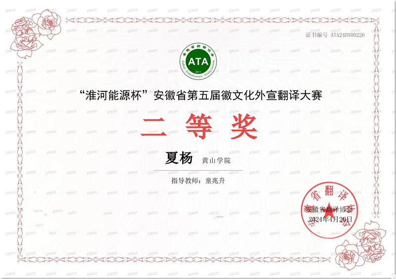 近日,“淮河能源杯”安徽省第五届徽文化外宣翻译大赛揭榜,由金年会官网童兆升老师指导的夏杨同学荣获二等奖,裴鑫、邹镇楠等2位同学喜获三等奖,贾曼、李文欢、周艺雯等3位同学分获优秀奖,获奖总人数达6人,创下该院学生参加此项赛事的获奖人数新高。4月20日,邹镇楠同学作为代表赴淮南师范学院参加了此项赛事的颁奖仪式。