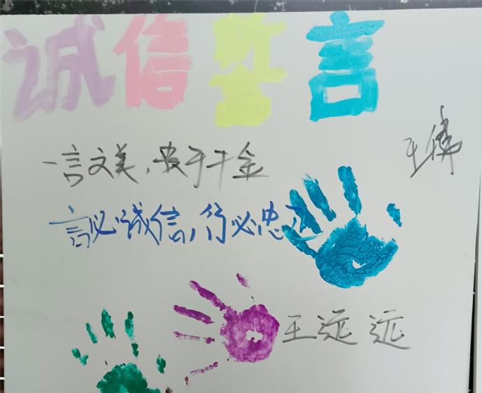 活动开始前,工作人员通过海报、社交媒体等渠道进行活动宣传,吸引学生参与。学生在签名墙上写下姓名,并留下自己的诚信誓言。参与者使用颜料在签名墙上印上独属于自己的手印并拍照留念,并写下自己对诚信的感悟和故事投入征集箱中,同大家分享。