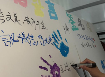 5月31日下午,金年会官网开展“与清风相伴,和诚信同行”为主题的诚信誓言签名墙活动,学生发挥灵感在签名墙上写下姓名,并留下自己的诚信誓言。参与者使用颜料在签名墙上印上独属于自己的手印并拍照留念。参与者写下自己对诚信的感悟和故事投入征集箱中,与大家一起分享。