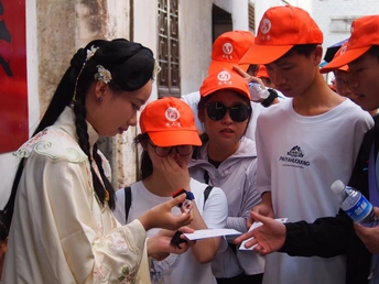 活动开始前,解方婷带领实践服务团成员进行实地考察并根据仁里景区地图制作具有仁里景区特色的明信片和印章,确定打卡点。实践服务团成员们迎着晨光穿着汉服,带着充满仁里气息的明信片前往仁里景区。汉服游园打卡活动共六个打卡点,每个打卡点对应一个印章(仁、义、礼、智、信、仁里),集齐六枚印章即可兑换由实践服务团成员们精心准备的小礼品,礼品摊放有制作好的调查问卷用于收集游客们对仁里景区的反馈和建议。