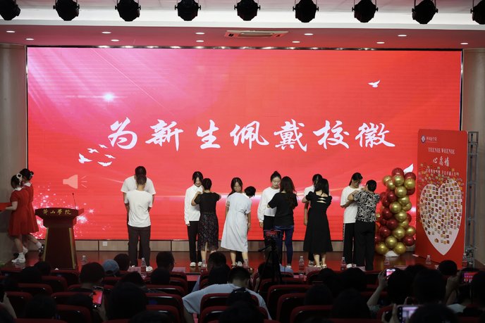 发言结束后,新生班级班主任上台为六名名新生代表佩戴校徽,并举行了集体宣誓仪式,领誓人的带领下,全体新生庄严宣誓:“我宣誓: 努力学习,勇于担当,不负祖国培养,不负恩师教诲,不负青春时光。请党放心,强国有我!”宣誓声响彻会场,彰显了新生们坚定的信念和昂扬的斗志。