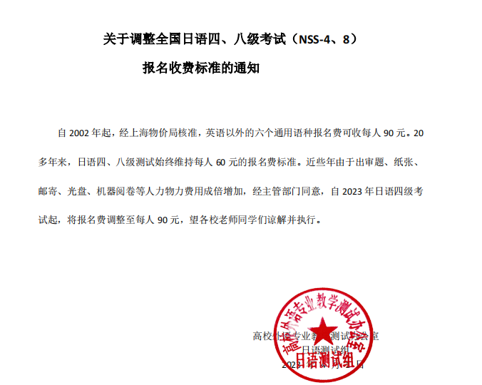 关于调整全国日语四、八级考试(NSS-4、 8)报名收费标准的通知.png
