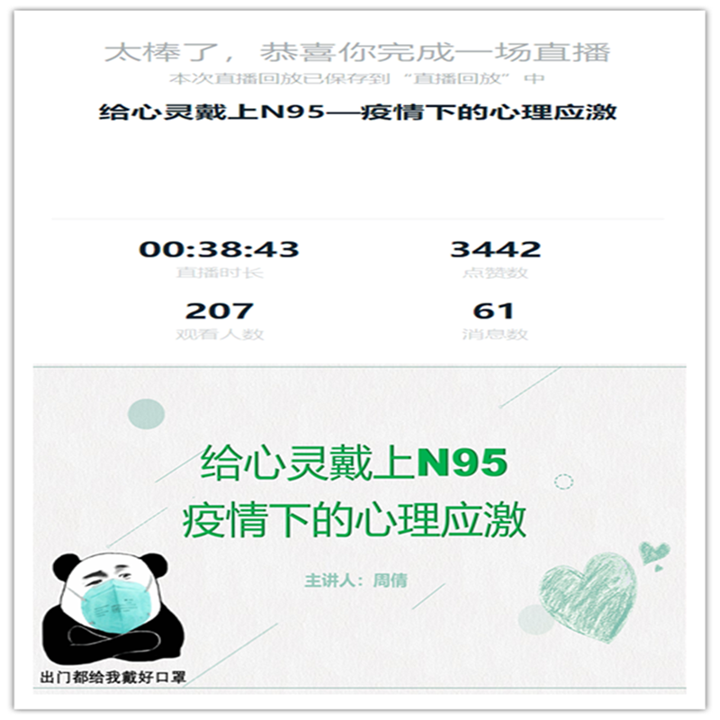 讲座伊始,周倩阐述了什么是应激、应激过程、疫情应激特点以及应激反应等四个方面;接着,她对在疫情期间我们该怎么办、如何进行自我心理调节进行了详细的叙述;指出了几点心理误区以及调整的手段。最后,周倩表示在疫情期间,同学们要学会调节自我情绪,调整心态,用一种积极向上的态度去面对现实,积极寻求专业帮助。