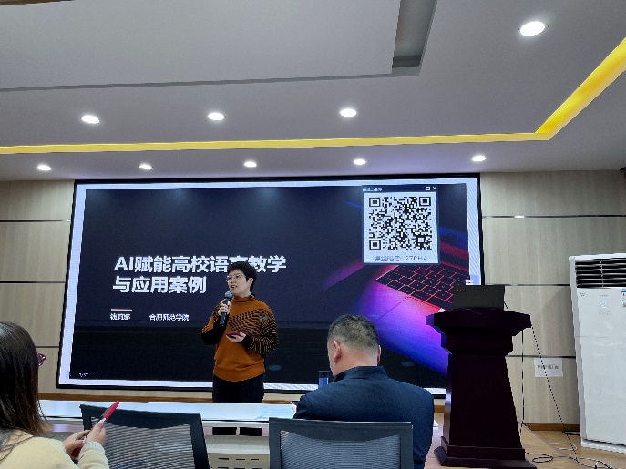 随后,钱莉娜作了主题为”AI赋能高校语言教学与应用案例”的专题讲座。讲座中,她详细介绍了AI的定义与分类,并通过实际案例展示了二者在教学场景中的广泛应用。一般智能AI如讯飞FIF口语系统用于学生语音评测与反馈;雨课堂、学习通等助力学习数据分析与评估,生成式 AI 则在设计教学素材、情景对话与创意任务方面大显身手。她指出,生成式 AI 在个性化学习中的应用令人瞩目,可以为学生定制学习路径、推荐智能内容、提供实时反馈并自适应调整练习难度,真正实现因材施教。针对教学中的痛点问题,钱莉娜还提出了涵盖课前、课中、课后的创新设计思路,为语言教学的优化提供了新方向。