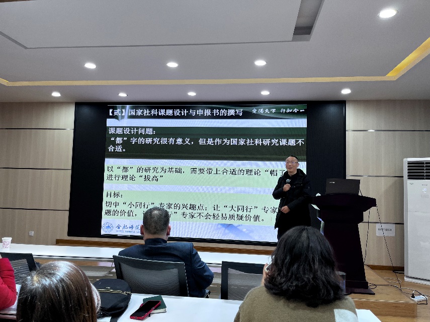 李可胜作题为“国家社科基金课题的设计与申报”的讲座。他作为省级高端人才引育行动项目特聘教授,曾主持多项国家级、省部级课题,在学术期刊发表多篇论文,经验丰富。李可胜深入剖析了当前外语教师面临的学科困境,如科研与教学难以平衡、学术成长受限等。同时,他详细讲解了国家社科课题设计与申报书的撰写要点,从选题的精准性、论证的逻辑性到申报书的规范性,都给予了实用且具有前瞻性的指导。
