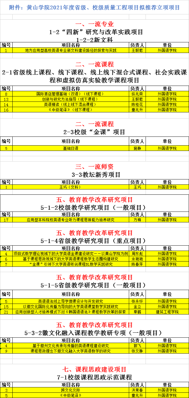 7 | 校级 | 五类 | 2015 | JINNIAN金年会校级科研项目 | 基于功能翻译理论的徽州饮食民俗英译研究 | 王巧 |