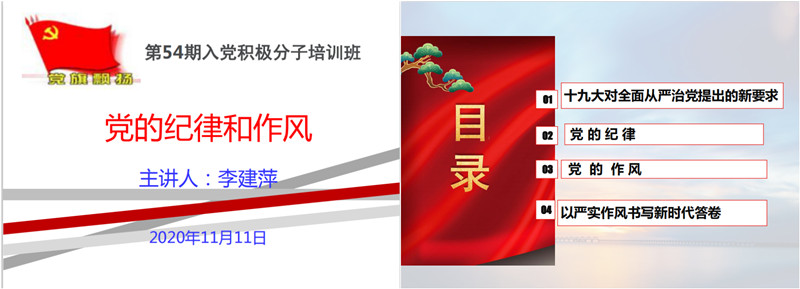 11月11下午,金年会官网教工第三党支部书记李建萍在逸夫综合楼5201教室54期入党积极分子作题为“党的纪律和作风”专题党课。