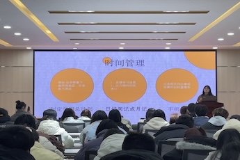 孙玉坤以“夯实基础·突破表达”为主线,系统解析发音训练、语法逻辑与演讲竞赛备赛技巧,并结合自身学业经验,强调“输入输出双轨并行”的学习策略。贾梦丽聚焦实战应用,通过日剧学习法、高效背词工具等案例,现场演示“碎片化时间管理”的进阶路径。互动环节中,两位主讲针对口语提升、应试焦虑等高频问题精准答疑,现场反响热烈。